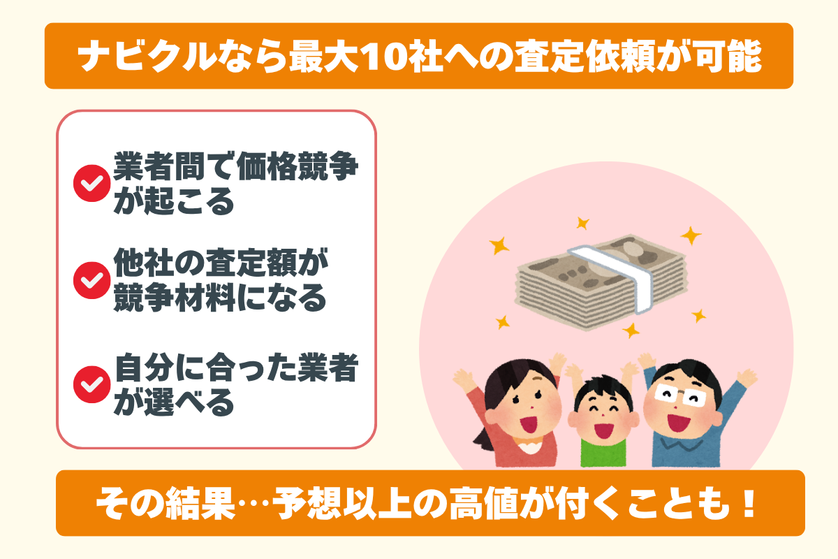 最大10社に査定依頼をするので、業者にも競争原理が働きやすく、思っていた以上の高値が提示される可能性も。