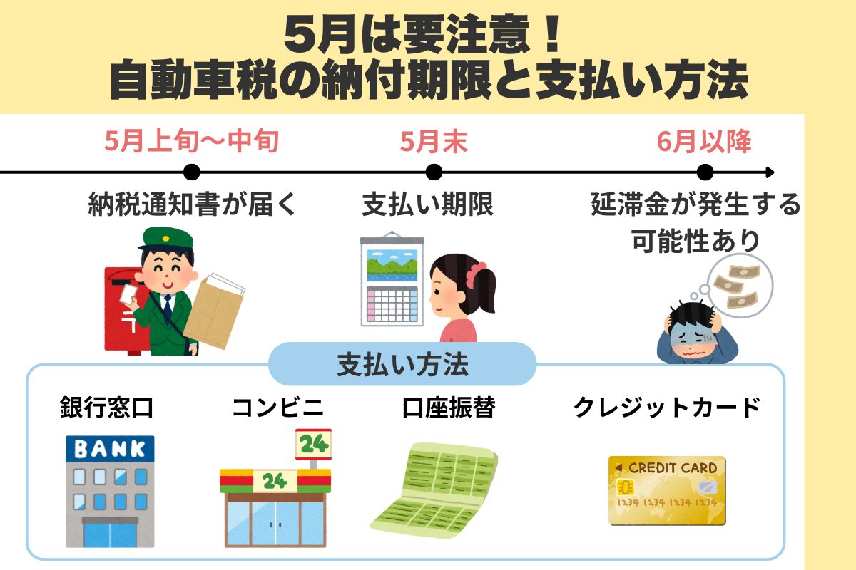 期限を過ぎてしまうと延滞金が発生する場合があり、また車検に影響する可能性もあるため、早めに支払ってくださいね。