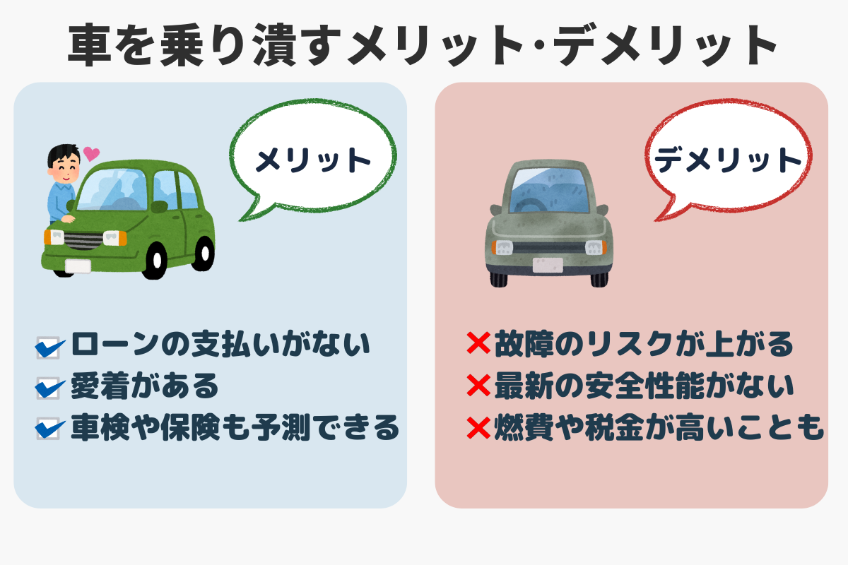 車を乗り潰すことのメリット・デメリットは以下のとおり。