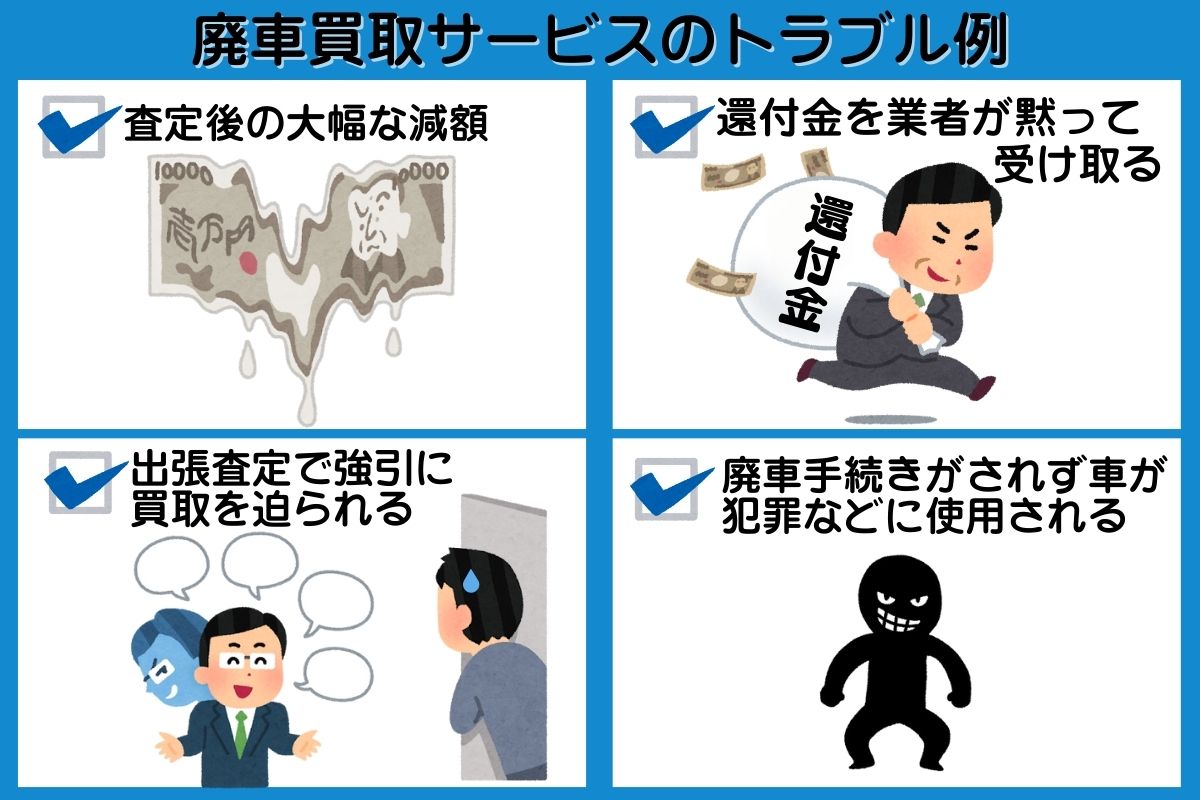 業者が多く質にばらつきがある廃車買取サービスでは、以下のようなトラブルが起こる可能性も。
