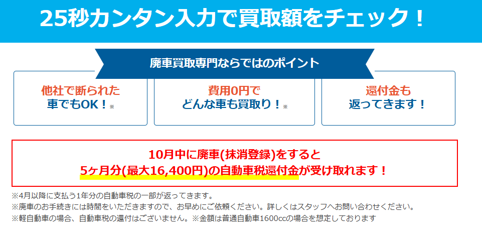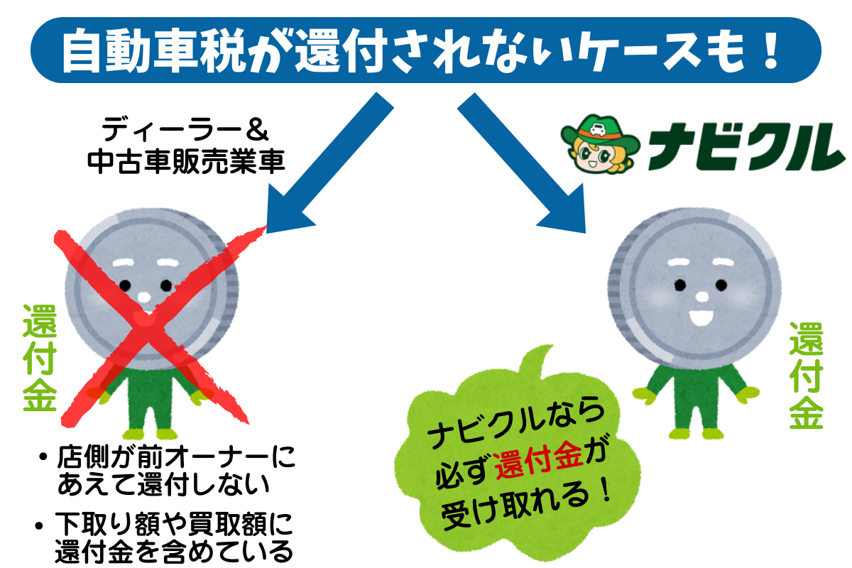 ナビクル廃車買取では、還付金の返金を明示していますので、条件が合えば自動車税の還付が受けられます。