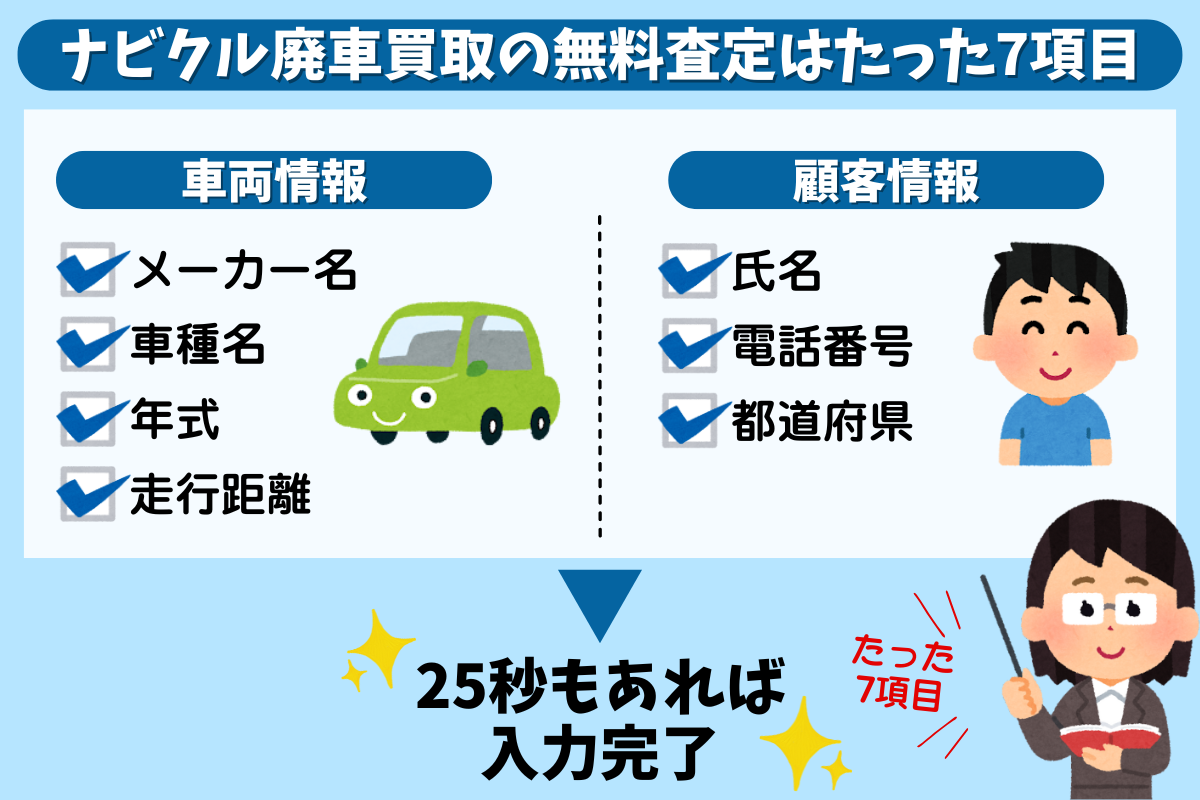 ナビクル廃車買取の無料査定はたった7項目で、25秒あれば入力が終わるほど簡単。