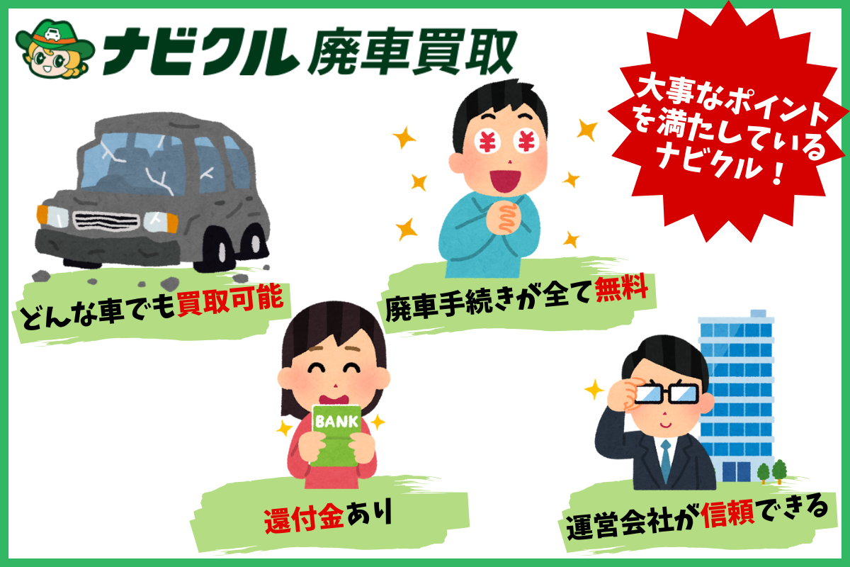 ナビクル廃車買取で特におすすめなのは、こちらのポイント3つ。