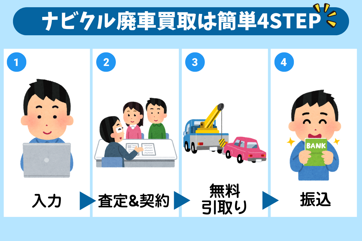 ナビクル廃車買取の利用はかんたん4STEPで完了。