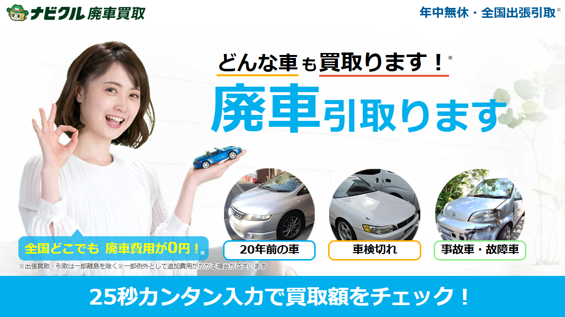 ナビクル廃車買取は、年式や走行距離、故障の有無に関係なく、あらゆる車両の買取に対応している廃車買取サービスです。