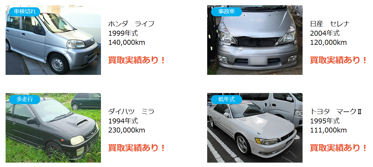 廃車買取専門ならではの「事故車」「故障車」「低年式」「多走行」の車も多数買取実績があります。