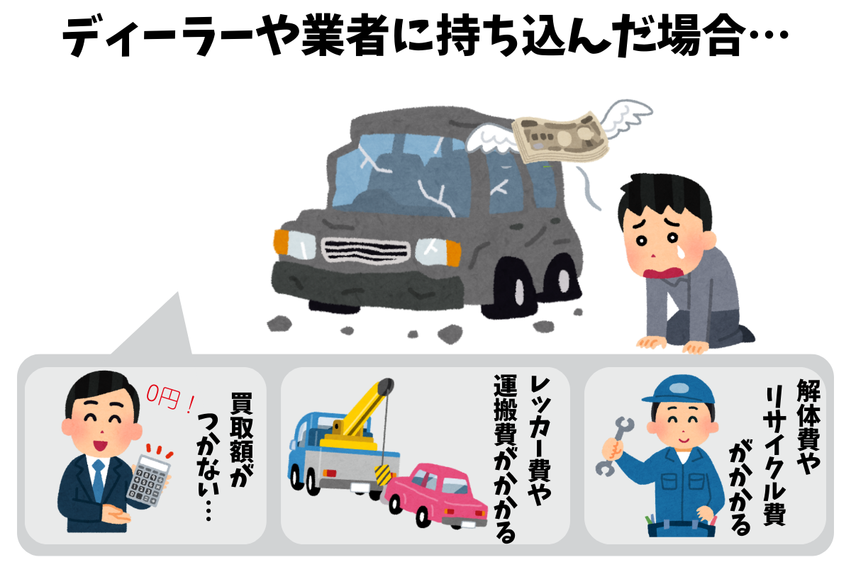 ディーラーや車の業者に持ち込んでも、リサイクル料金や解体費用、運搬費用などで数万円請求される可能性も。
